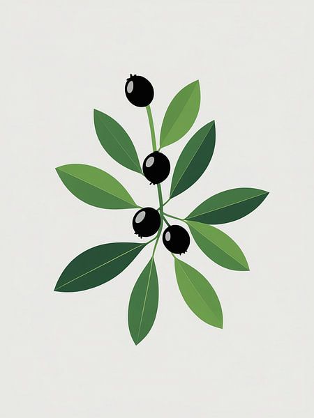 A contemporary botanical illustration featuring a symmetrical arrangement of dark berries and lance-shaped leaves in varying shades of green. The circular composition highlights the natural geometry of the plant, with four glossy black berries creating striking contrast against the soft neutral background. This artwork celebrates the…