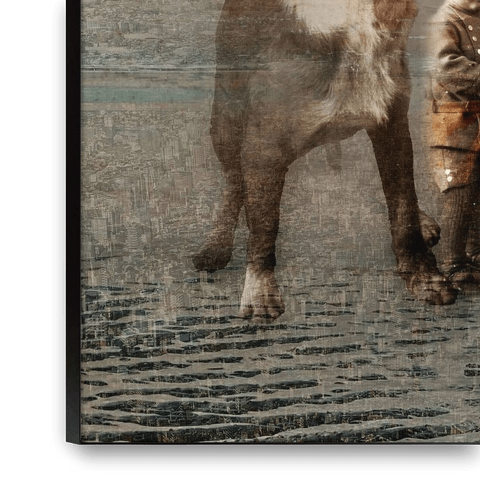 The image conveys the deep relationship between humans and animals. The soft pastel colours, warm beige, gentle blue-green and earthy brown, create a harmonious atmosphere. The dog symbolises loyalty, trust and safety, while the boy, holding a large flower in his hand, radiates innocence and curiosity about life. If you look closely,…