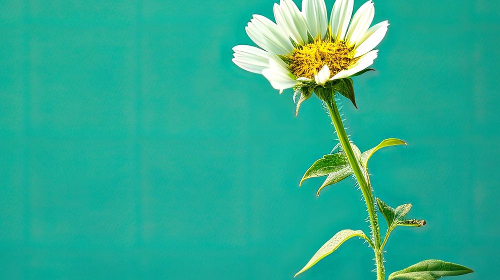This image shows the stunning image of a single flower growing boldly from a cracked, dry surface. The freshness of the flower with its delicate white petals and striking yellow centre contrasts sharply with the cracked, turquoise surface.