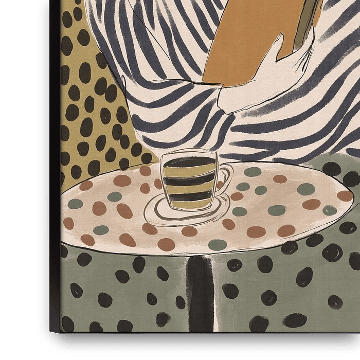 A minimalist, fashion-inspired illustration of a woman reclining comfortably while reading, surrounded by bold patterns—stripes and polka dots—paired with a soft, earthy color palette and a calm, introspective mood