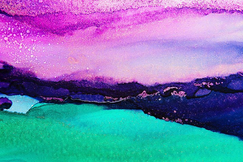 "Tussen Dag en Nacht" (the contrast between the light pink and the deep green/blue) This is an abstract artwork created using the alcohol ink technique. The composition is layered horizontally and evokes the feeling of an otherworldly landscape or a microscopic detail of a gemstone. The work is composed of three distinct…