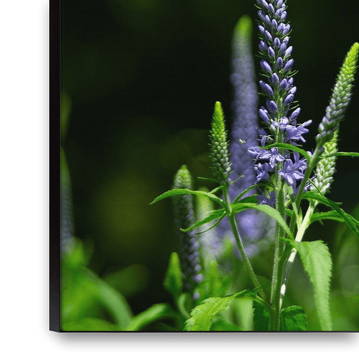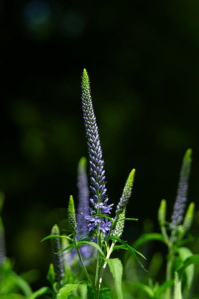 The photograph shows a slender, purple flower that grows powerfully and straight upwards, bathed in a soft light that makes it almost glow against a deep, dark green background. What immediately strikes the eye is the colour contrast — the fresh violet against the velvety green. But if you look longer, you will discover more. At the…