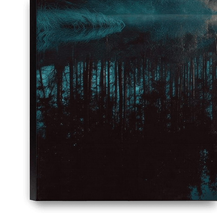 A tranquil lake lies hidden between dark forest edges, where mist glides low over the water and the air hangs heavy with anticipation. Blue and green hues blend with soft gold from the clouds, reflected in an almost perfect mirror image. The boundary between sky and water blurs, while the landscape breathes in slow tranquillity. This…