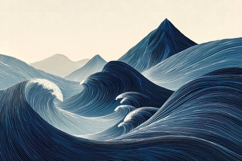 Between Sea and Mountain depicts a fluid transition from water to height. Along a vertical axis, stylised ocean waves gradually transform into abstract mountain contours. The transition is seamless and natural; movement slowly becomes stillness.