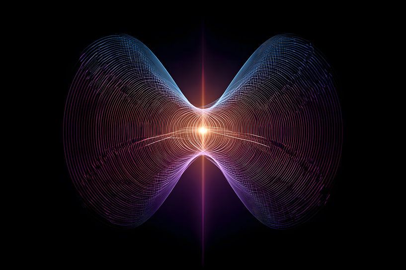 A symmetrical, undulating structure unfolds against a black background. Delicate, luminous lines form a pulsating, almost organic field that condenses towards the centre, where an intense core of light radiates. The colour gradients from violet through blue to warm orange create depth and a flow of energy. The form is reminiscent of…