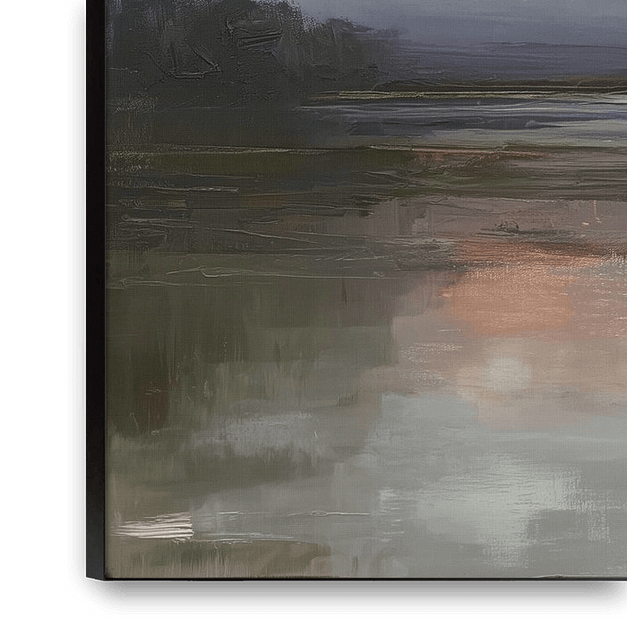 hushed landscape stretching under an overcast sky, in which the light of the setting sun gently breaks through the cloud cover. The horizon is set low, separating the sky from a mirror-smooth surface of water that subtly reflects the surrounding landscape. The colours are subdued: shades of grey-blue, soft purple, and earth are…
