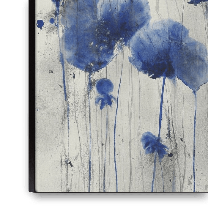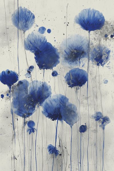 Deep blue flower shapes float like watery imprints on a light background, as if they have been knocked out of a dream. The flowers appear to be constructed from flowing ink, with edges that blur into the paper and droplets that have slowly trickled down like tears. Long, thin stems suggest fragile connections to an invisible ground,…