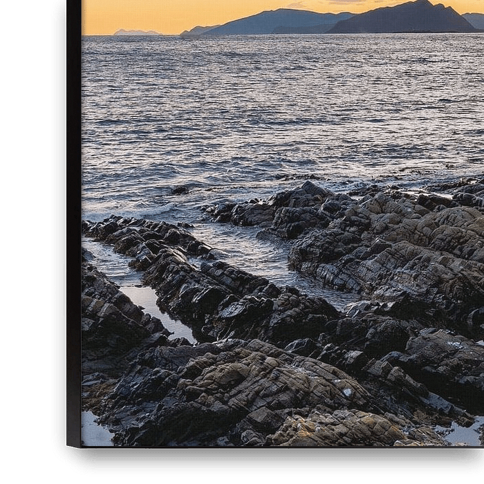 The rocky coast is still in shadow. Wet stones and shallow pools reflect the soft light, giving the image texture and…