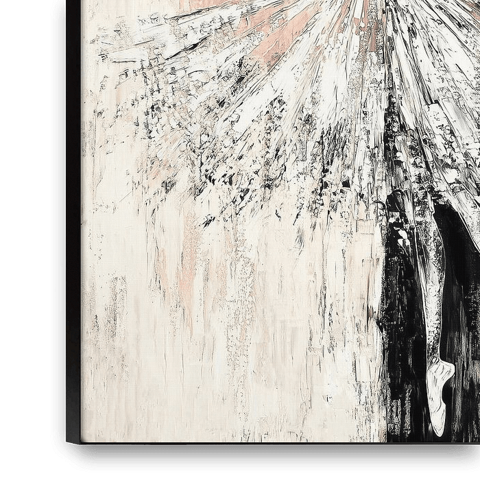 The image shows an enchanting ballerina moving elegantly between shadow and light, symbolised by the black and white areas in the background. Her movements seem to bridge the dark and light parts of the composition. The pink circle, centrally placed, radiates a soft yet striking colour that breaks through the monochrome background and…