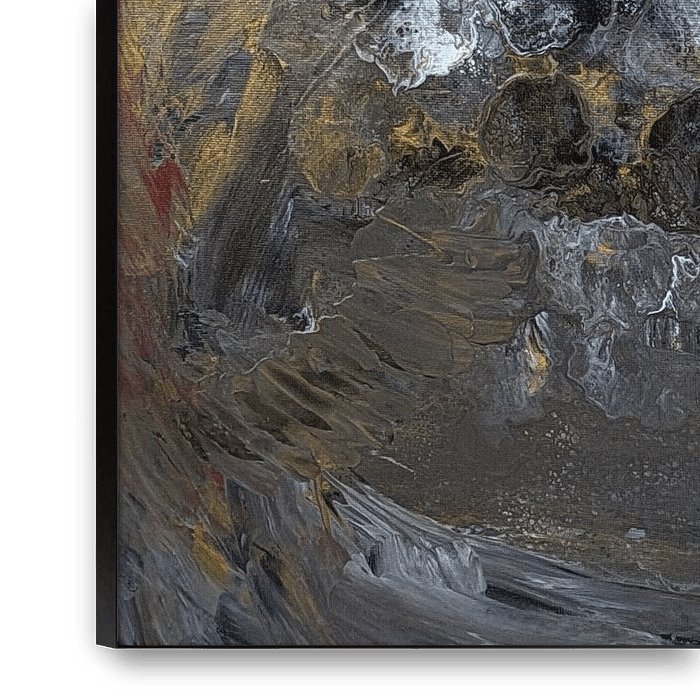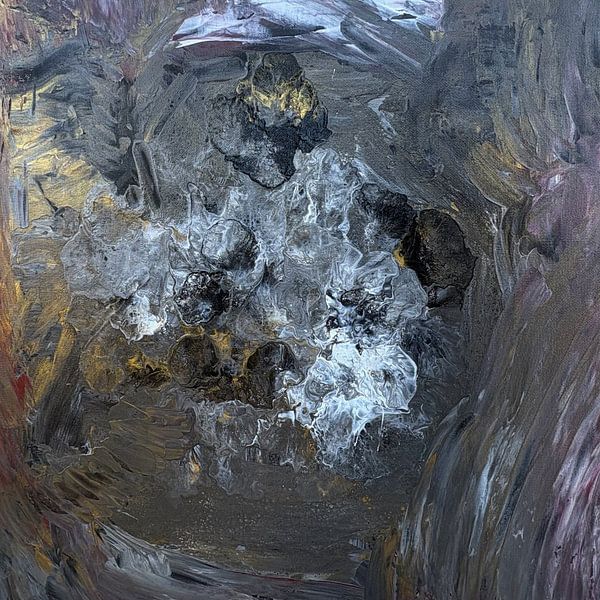 Zwischen Stille shows a state between compression and dissolution. Layers of grey, white and dark tones condense into organic forms that appear stable and fragile at the same time. The picture moves in the field of tension between materiality, depth and quiet dynamism.