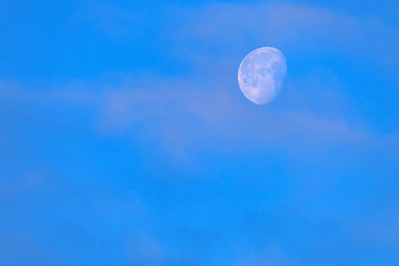 The strong contrast to the azure blue sky emphasises the fine details of the moon's surface.