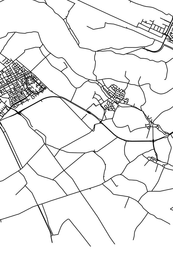 Black and white map, street map or street plan of Beusichem. Beusichem is located in the Betuwe, in the municipality of Buren, province of Gelderland. On the city map all public roads in Beusichem are included. Furthermore, the map is provided with the coordinates of the center of Beusichem.