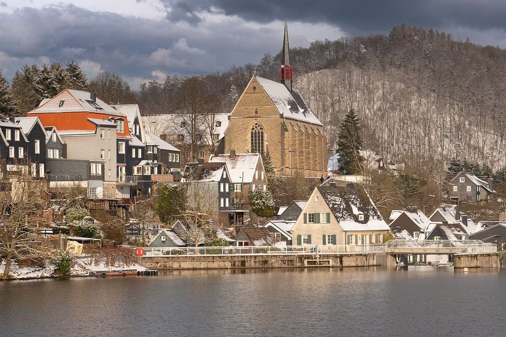 Panoramic view of Beyenburg near Wuppertal in winter atmosphere, Bergisches Land, Germany