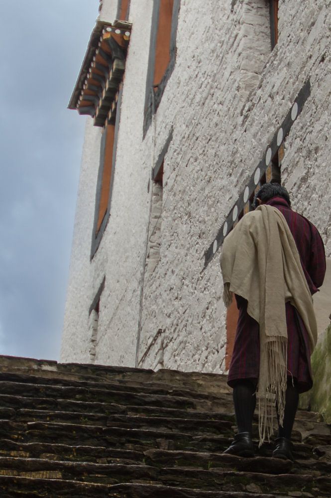 This is Ugyen, my guide in Bhutan. In Bhutan it is obligatory to wear traditional clothing while working. When you enter a Dzong, like in this case, you have to add the white scarf. A Dzong is a secret building in Bhutan with both government buildings (both local and national) and a tempel.