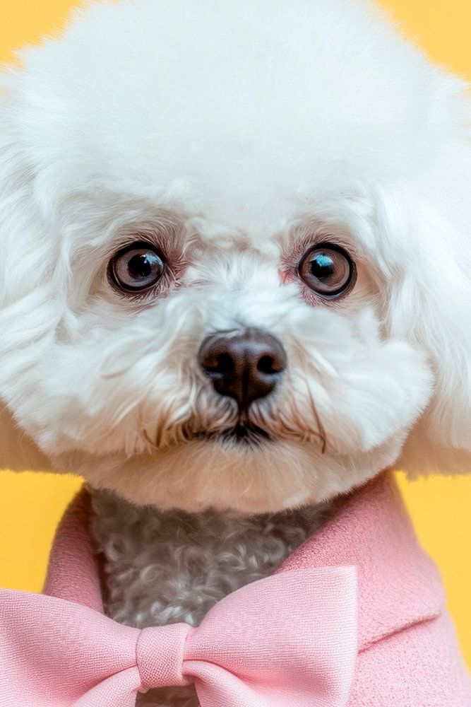 With bright white curls and a charming, appealing look, this Bichon Frise exudes pure elegance. Dressed in a cheerful, pink-coloured suit with a cute bow tie, he embodies the perfect blend of style and playfulness. Against a bright yellow background, he attracts everyone's attention and radiates joie de vivre!