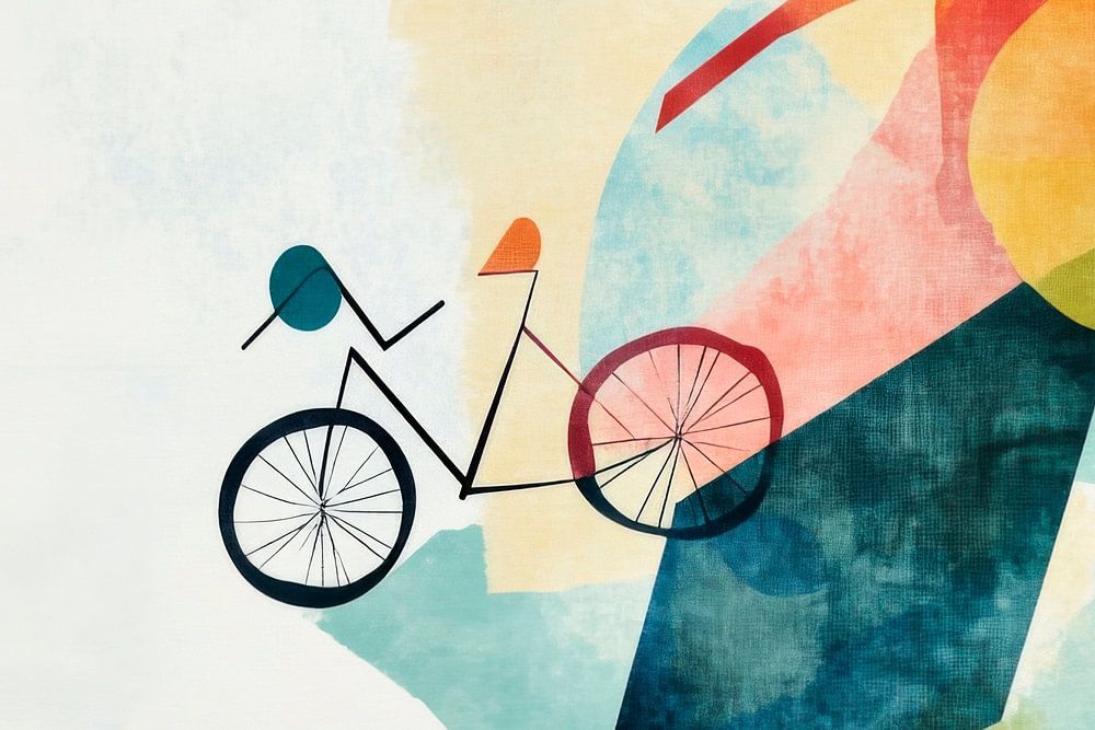 A harmonious interplay of soft colours and geometric shapes unfolds as a stylised bicycle rides through the artistic landscape. Consisting of lively circles and dynamic lines, the composition radiates timeless lightness and joie de vivre, as if inviting the viewer on a colourful ride.