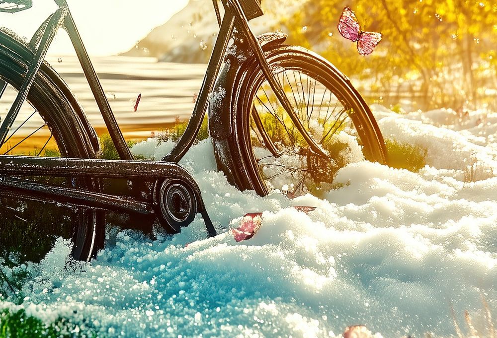A vintage bicycle stands in the melting snow, surrounded by colourful butterflies. This scene symbolises the transition from winter to spring and the promise of warmer days full of life and colour.