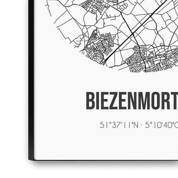 Black and white map, street map or street plan of Biezenmortel. Biezenmortel is located in the municipality of Haaren, province of North Brabant. The city map includes all public roads in Biezenmortel. Furthermore, the map is provided with the coordinates of the center of Biezenmortel.