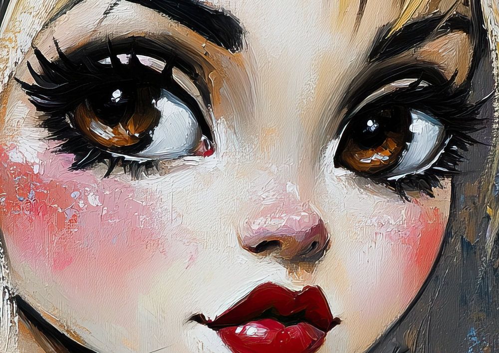 Big Eyes - This woman painting shows a girl with big, expressive eyes and a striking red lipstick, surrounded by hearts in different colours, giving a cheerful and playful atmosphere to the artwork.