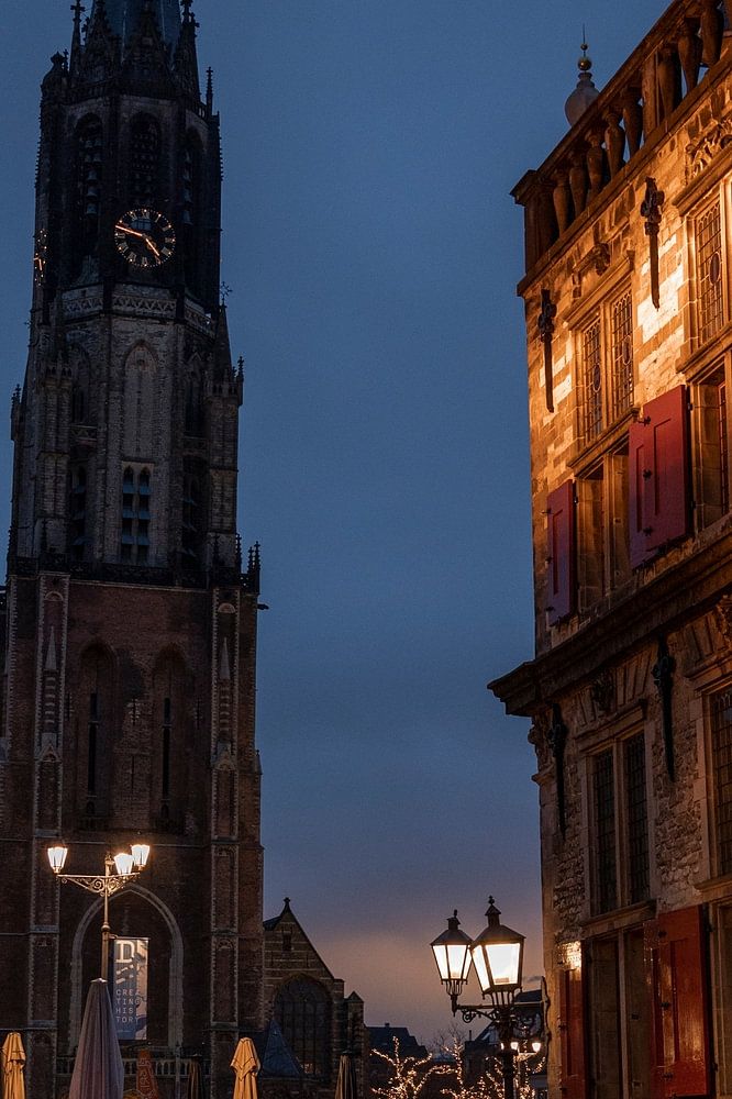 The large marketplace shot from a different angle with the city hall of Delft beautifully highlighted. People shopping for Christmas make the cozy frame.