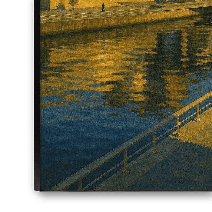 Inspired by the quiet balance and meditative energy found in Edward Hopper’s work, this piece blends modern architecture with timeless mood. The geometry feels softened by warmth, and the reflections create a dialogue between steel and water, solidity and impermanence. It’s both a celebration of human design and an ode to stillness.