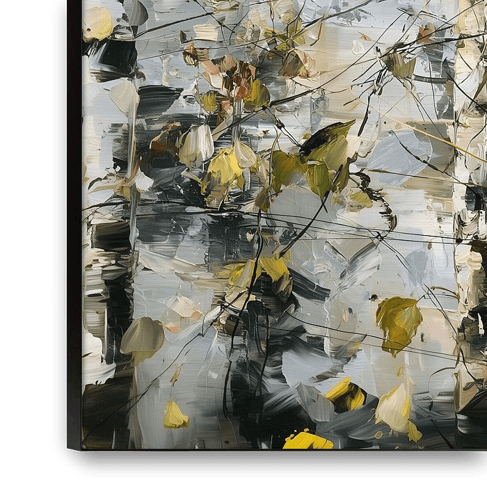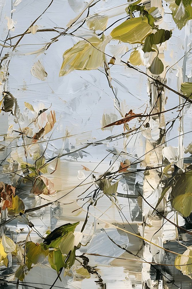 This impressionistic artwork depicts slender birch trunks whose delicate branches are interspersed with autumn-coloured leaves. The loose, textured painting style combines light, movement and nature to create a tranquil, atmospheric forest scene. Soft shades of grey, white and gold create a harmonious mood and convey the quiet beauty of…