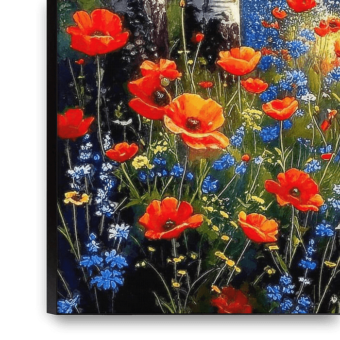 This work unfolds in a finely nuanced, slightly impasto style of painting and leads the viewer into a quiet birch forest. A narrow path winds its way through the centre of the scene, gently passing red poppies and blue cornflowers. In the foreground, a lively, almost breathing flower meadow spreads out, interspersed with wild grasses…