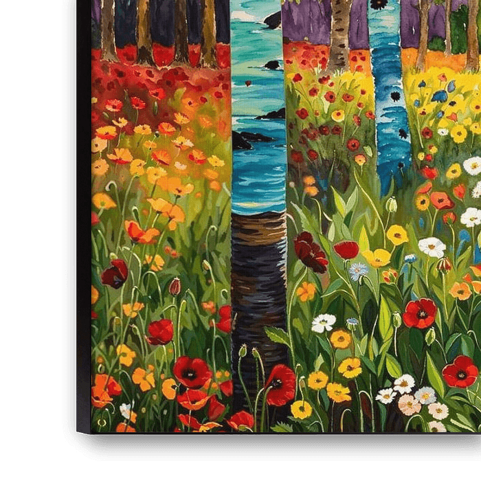 "Birches and Flowers" is a vibrant and colourful painting that combines the splendour of a birch forest with an abundance of wildflowers. This work captures the essence of a serene, natural setting where the white trunks of the birches contrast elegantly with the explosive colour spectrum of the blooming flowers.