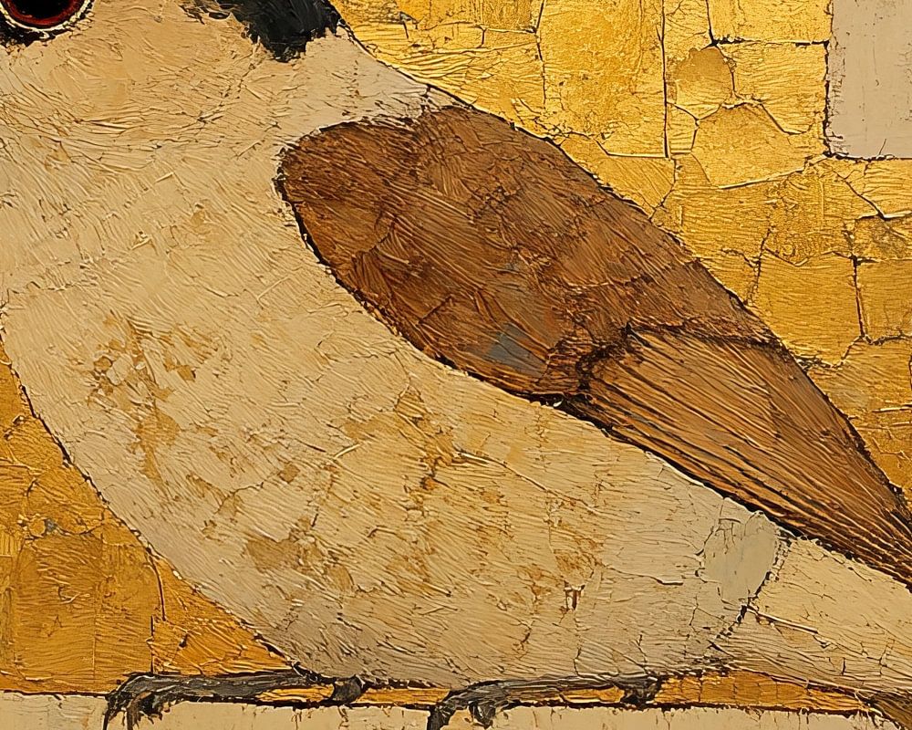 Details: bird, gold, colourful, modern art, oblique, brown, black, white, abstract, composition