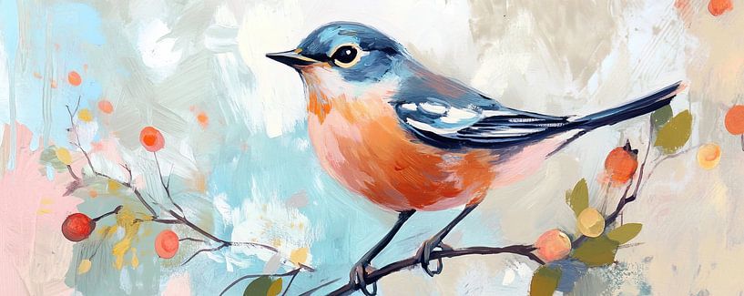 Bird | Cheerful Summer Bird on a Branch - This bird painting depicts a cheerful bird with a blue head and orange breast sitting on a branch, surrounded by colourful leaves and berries, giving the painting a summery, garden-like feel.