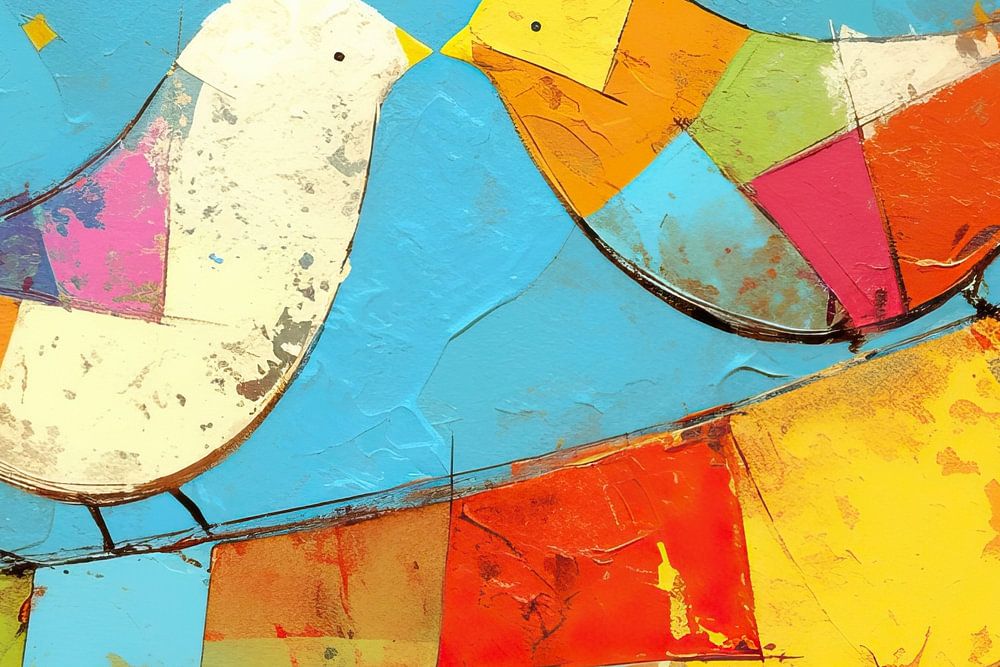 Bird Painting | Vibrant Bird Whispers - This colourful bird painting shows two stylised birds sitting against a vibrant background of composite blocks in a spectrum of bright colours, giving a modern and playful impression.
