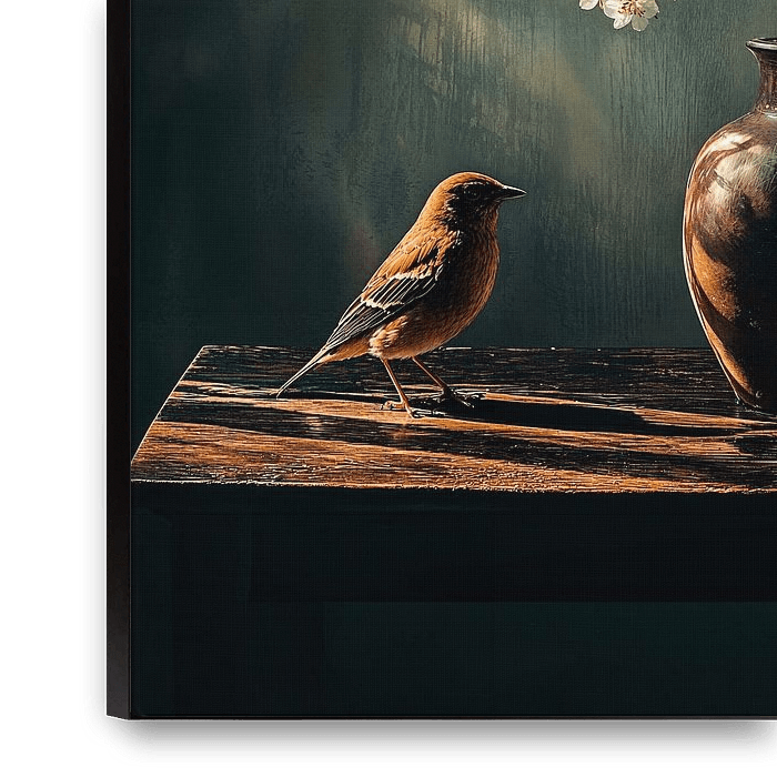 This serene artwork captures the simplicity and beauty of nature at a glance. A small bird, sitting quietly on a wooden table, shares the composition with an elegant, dark vase filled with delicate blossom branches. The soft lighting creates a warm contrast between the deep tones of the wood and vase and the sparkling white blossoms,…