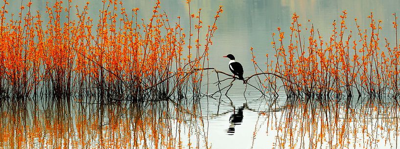 As if you were standing on the bank one very early morning, when only a single bird and the soft rustling of the reeds are aware of your presence. In this serene panorama, a solitary bird perches on an elegant, curved branch in the middle of the water. On either side, a sea of slender, orange reeds rises up, like fiery flames that…