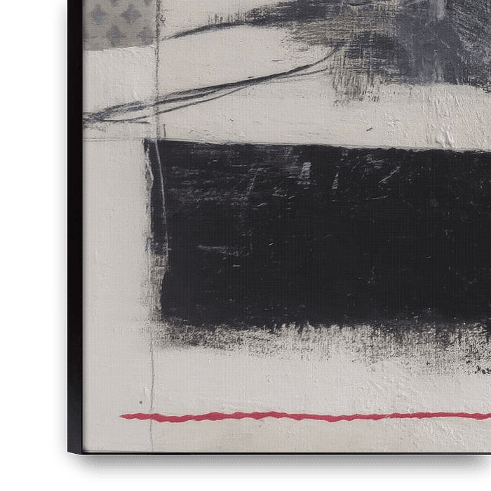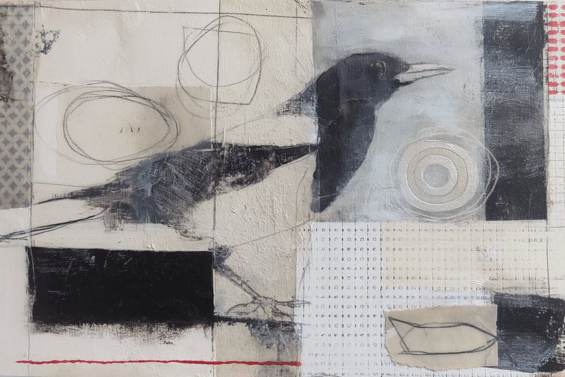 A multi-layered work centred on a black bird, surrounded by abstract forms, lines and subtle textures. The combination of sketch-like elements and painterly surfaces lends the piece an exciting and distinctive character.