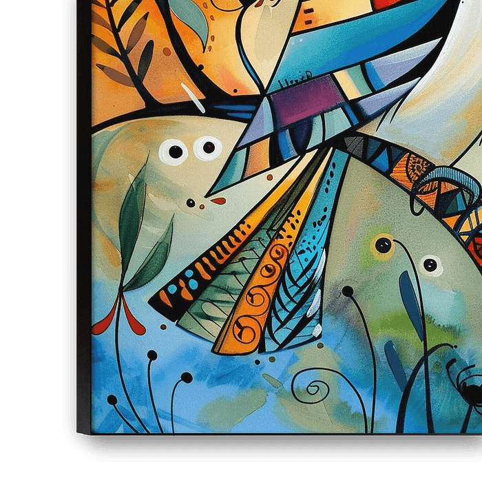 In a world steeped in colour and dream, a bird of paradise walks through the air like a living painting, its wings painted with the hues of a sunset. Its landing on a branch resembles a scene from a cubist tableau, where abstract forms come together in a harmony of chaos and order. The bird looks around in wonder, enchanted by the surreal landscapes that cross his path, an endless source of inspiration and wonder.