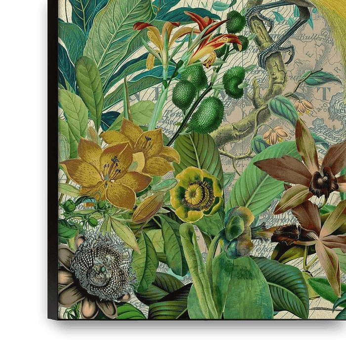 tropical bird surrounded by flowers and branches and exotic fruits