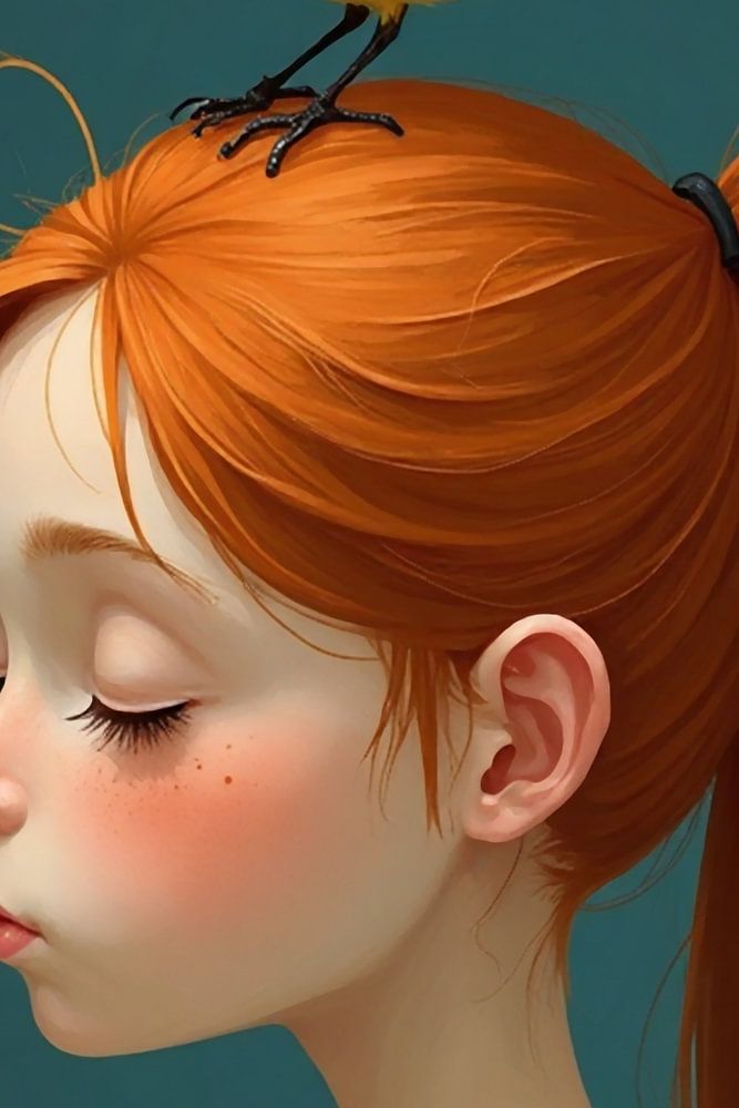 This artwork exudes playful charm and elegance, with a girl with vivid orange hair wearing a small bird on her head. Her deep blue dress forms a beautiful contrast, creating a dreamy and mystical atmosphere. Perfect for an interior that embraces colour, nature and artistic sophistication.
