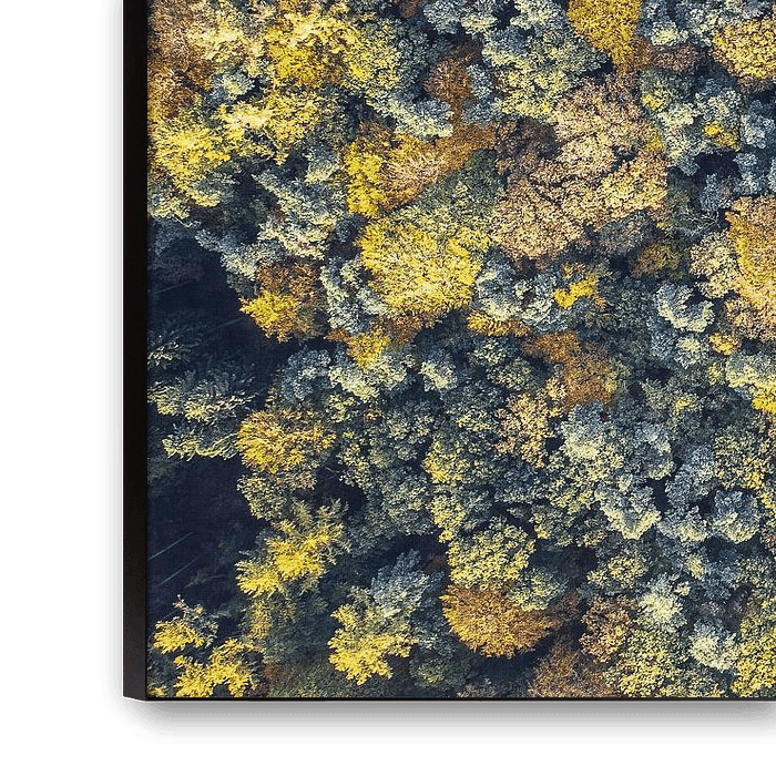 A captivating aerial view showcasing the vibrant autumnal hues of the forest, flanking a serenely winding road. This photograph highlights the seasonal transition of nature, with a mix of golden yellows, deep greens, and hints of rustic browns. Perfect for those who appreciate the beauty of fall from a bird's-eye perspective.