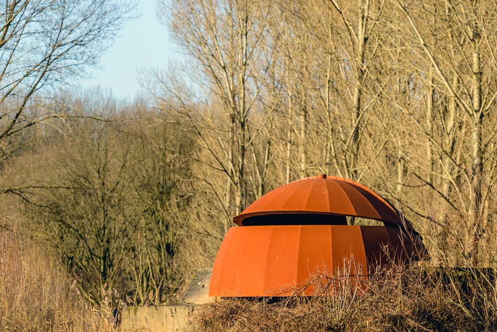 The bird watching hut from rusty steel, built in 2012 on the ruins of a dome casemate, stands between withered bushes and in the foreground of tall bare trees in the De Zevenbansche Boezem nature reserve near the Dutch village of Sleeuwijk, municipality of Altena, province of Noor-Brabant. The design of the viewing cabin was made by the visual artist Arie Huisman from Hardinxveld-Giessendam. In the background is a concrete bunker. The picture was taken on a sunny day in winter