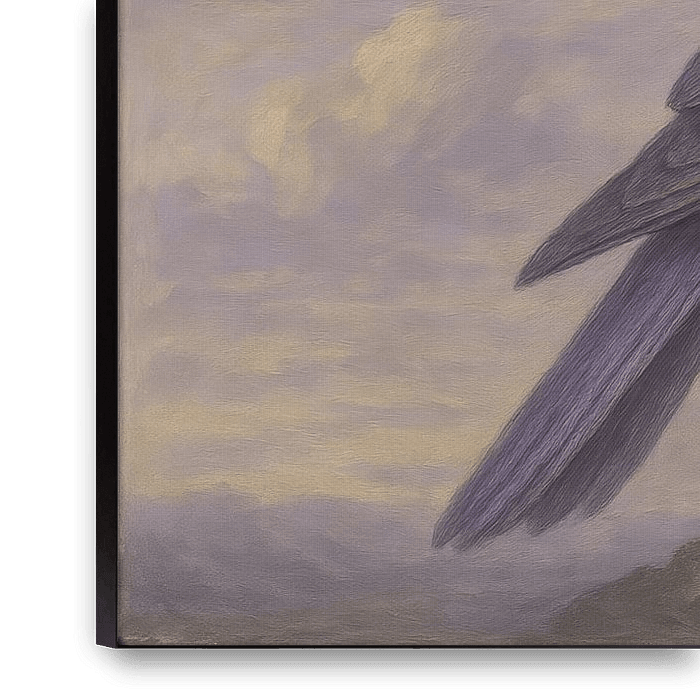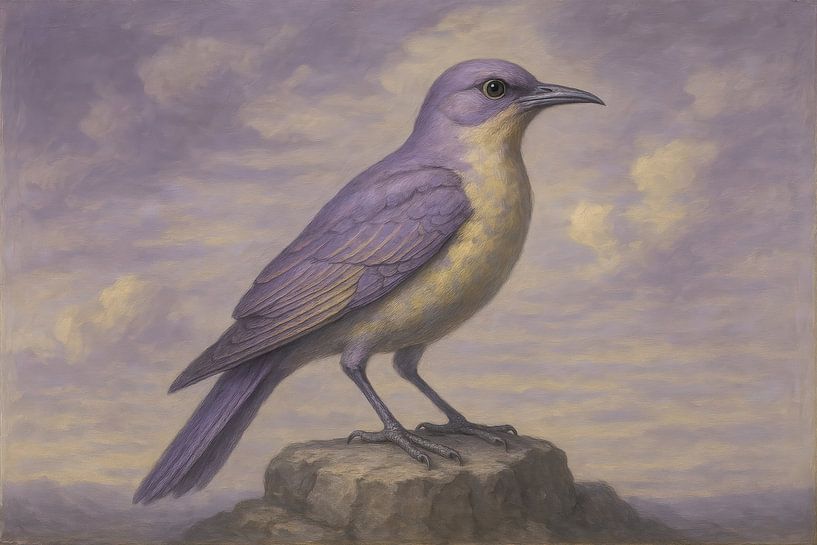 A purple bird stands in calm profile on a rough rock, with a cloudy sky drifting away in soft shapes. Subtle brushstrokes emphasise the texture of feathers and stone, while diffused light creates a calm atmosphere. The contrast between cool purple tones and the warm nuances of the rock gives depth to the scene. The composition is…
