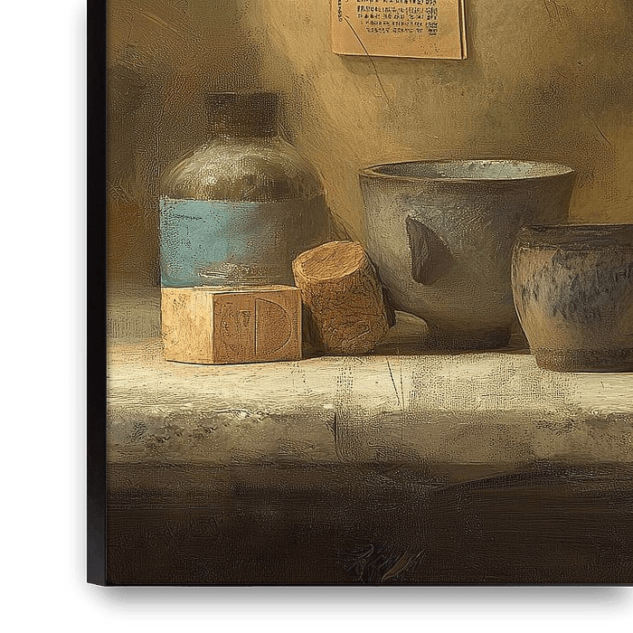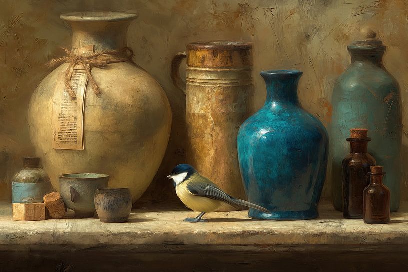 Bird and Vases - This still life painting clearly depicts a classic, realistic still life featuring two prominent vases — a large round beige jug and a glossy turquoise/blue vase — and a small, lively bird perched on the shelf. Painted in warm earth tones with soft brushstrokes, the painting has a modern Japandi feel and fits perfectly…