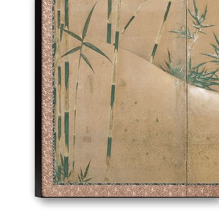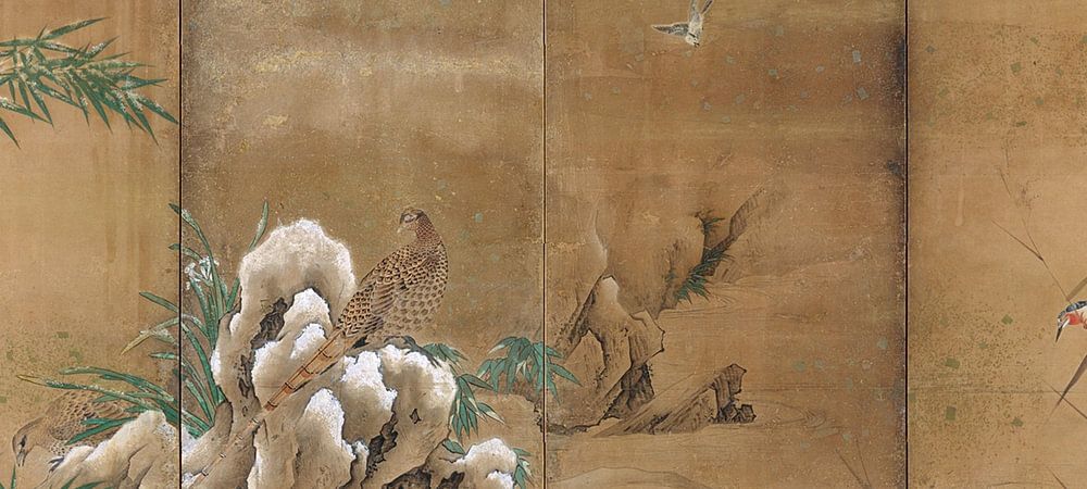 On the right screen are plum blossoms with other spring flowers nearby; further to the left are the irises of summer in bloom. Nightingales and cuckoos celebrate both seasons. The left screen shows autumn and winter, represented by hibiscus, snowy bamboo, a kingfisher, and pheasants. Each screen bears two seals of Kano Sanboku. Little is known about Sanboku, except that he was a student of both Kano Sanraku (1559-1635) and Kano Sansetsu (1590-1651), the two great masters of the Kyoto branch of the Kano school. His subdued depiction of the four seasons is reminiscent of Sansetsu's art and is almost colorless, eschewing the exuberance that was attractive to the warrior customers of the early Edo period.