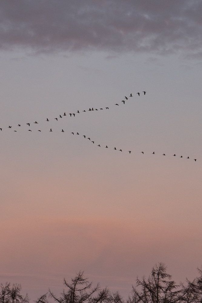 A beautiful morning in January. During sunrise, a flock of geese flies over a beautiful nature reserve in Friesland. The rising sun turns the sky beautifully pink. The sound of the geese and the wind through the tops of the trees, you can almost hear it as you watch this image. It gives a lovely calming feeling, warm and cosy.