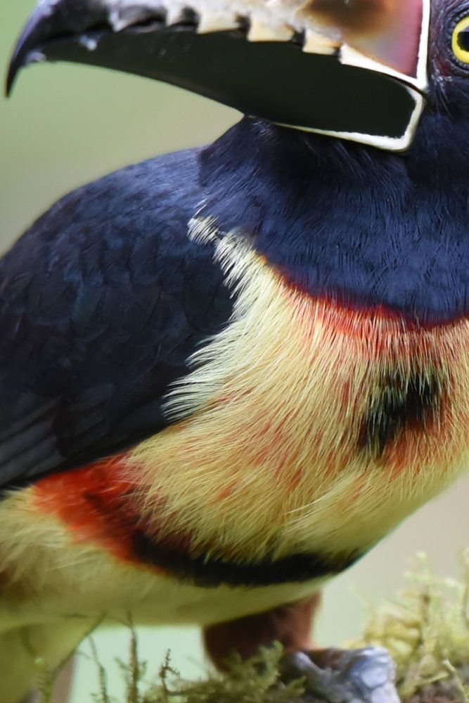 Like other toucans, the collared aracari is brightly marked and has a large bill. Males and females have the same coloration of the bill and plumage but the female's bill is shorter than the male's. The collared aracari inhabits the interior and edges of evergreen primary forest and mature secondary forest and also coffee, cacao, and fruit plantations. In the semi-arid parts of northern Colombia and Venezuela it also occurs in gallery forest. In elevation it is found from sea level to about 1,000 m.