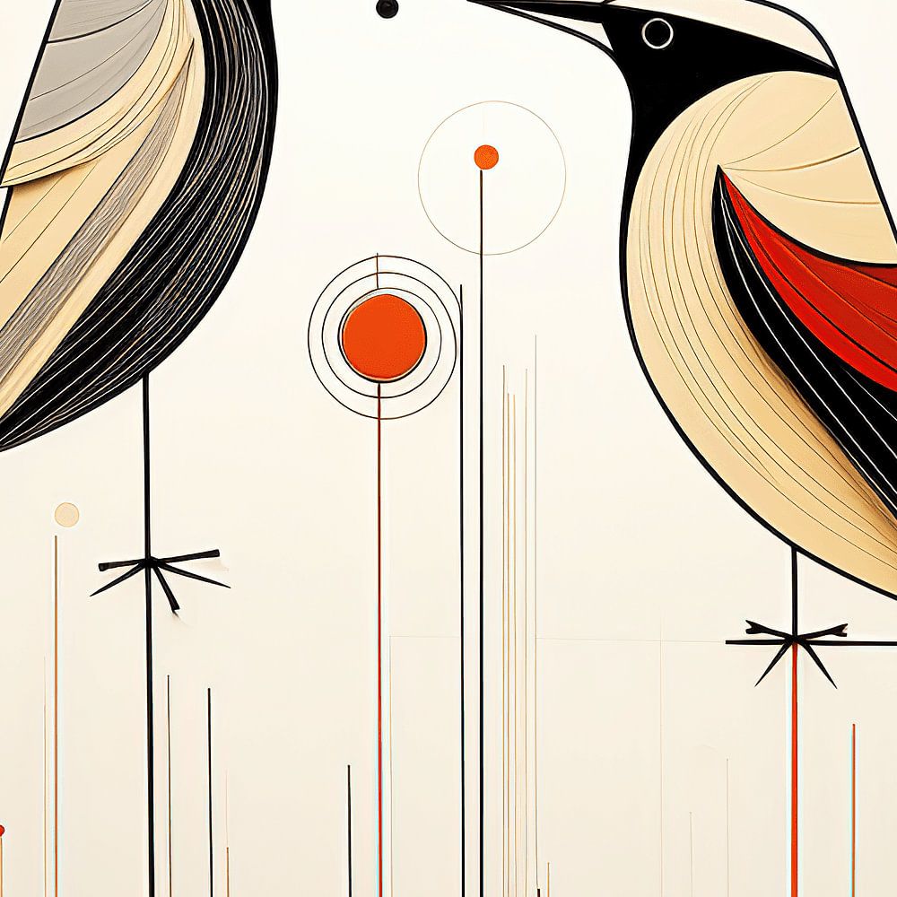 A minimalist illustration of two birds on a wire, with colorful geometric shapes in the background.