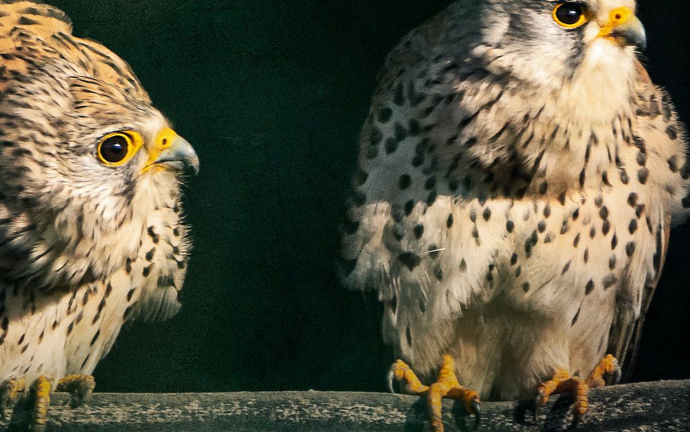 2 Kestrels together on a fence. dark photo worth because of the birds of prey standing out. Bird Photography .