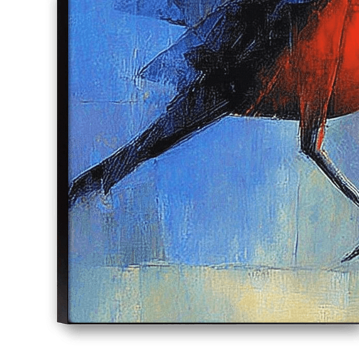 A landscape where silence is not still. The birds seem to be running - not away, but along with the wind, like thoughts suddenly flying up. The tree in the middle offers shelter, like a reminder of calm amidst movement. This work captures the paradox of liveliness and serenity in one image. The colours are rich and layered: ochre, old rose, leafy green and a hint of blue combine to form a harmonious composition.