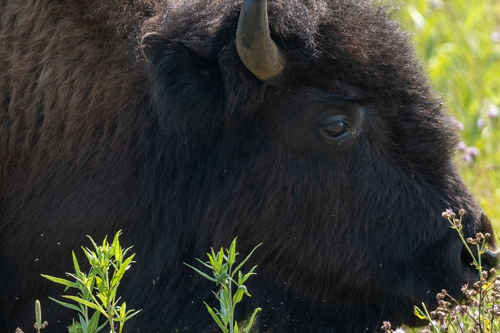 A bison in the tall flowery grassland of Custer State Park, South Dakota, USA.