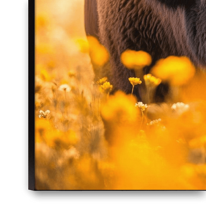 With soft light framing the golden flowers, a majestic bison moves through the colourful floral splendour. Its imposing horns and powerful body radiate strength and grace, while its tousled curls dance in the gentle breeze. A harmonious combination of wildness and natural beauty that epitomises the fascinating moment of nature.