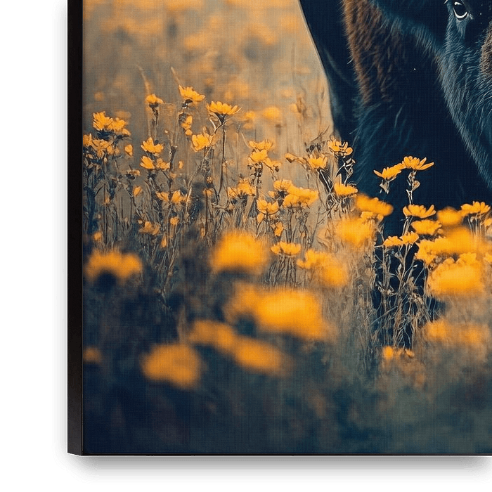 The mighty buffalo rises majestically and proudly from a sea of golden yellow flowers, its deep brown fur glistening in the soft light of the early morning. Its powerful horns and intense gaze lend it an aura of ferocity and majesty, while the misty background mystically envelops the scene. A truly iconic creature of nature.